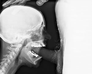 Cephalometric, panoramic, x-rays do allow for you to see the nose, lips, and chin. On these films and periapicals, you can see nerves in individual teeth and the nerves in both jaws. If you can see the nerve paths in the jaw, you would also be able to see the nerves and blood supplies in the penis. The image has his penis as transparent and without detail.
