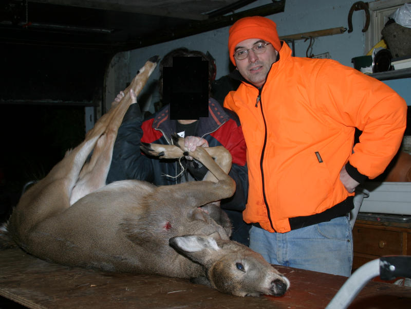 The lady with me is my mom, who is not too keen on having her pic on adult webmaster boards... :-) This pic (of me) was taken tuesday, just before we prepared it for the freezer. The bullet hole you see is not the entry point but the bullet exit point. We are not stupid enough to waste shoulder meat on purpose... It was shot with a hand-reloaded 150g Nosler Ballistic Tip Boat Tail Spire Point .308" bullet in a medium-power bolt-action rifle.