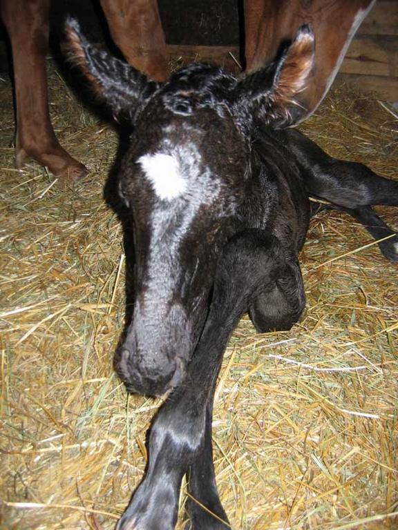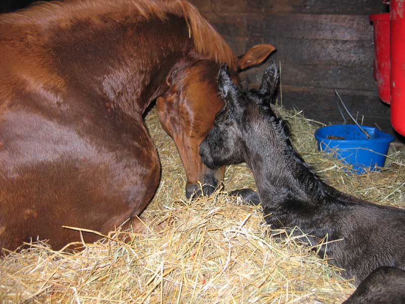 Roxanne foaled last night around 8pm and had a filly. Here are some pics, though I didn't get any real play by play action because one of the other mares was trying to steal the foal at birth and we had to chase her away.
