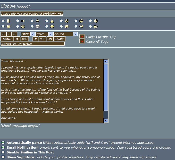 you may want to check into your options of the board and see whether it is preset to italics..