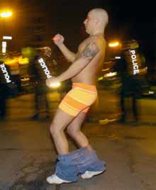 The crowd soon grew rowdy and began damaging trash cans and exposing themselves to passersby on Ste-Catherine Street, slowing traffic on the busy commercial strip. The riot squad intervened about thirty minutes after the trouble began, and then left the area when the traffic flow resumed.