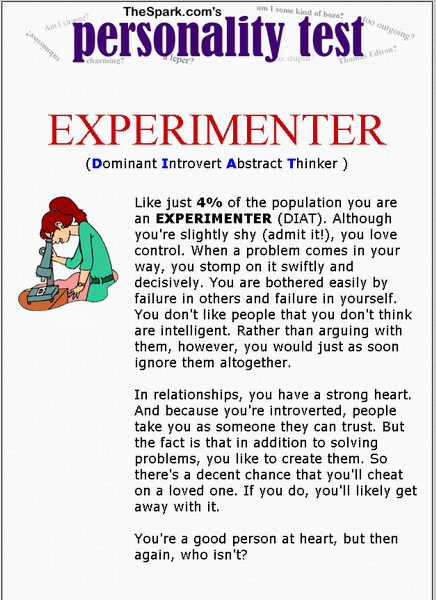 Like just 3% of the population you are a BUSINESSMAN (DECT). Hide the children and protect the bunnies, basically. In ancient times you would be a deadly barbarian. These days, you're perfect for Wall Street. You prefer concrete thinking to a more creative style, and your direct modes of thought and action help you succeed in whatever you may try to accomplish.