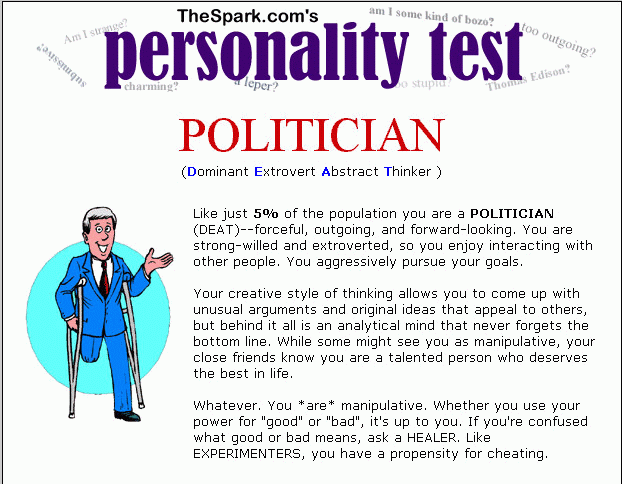 I'm a politician too... not surprised. Pretty cool and accurate test!