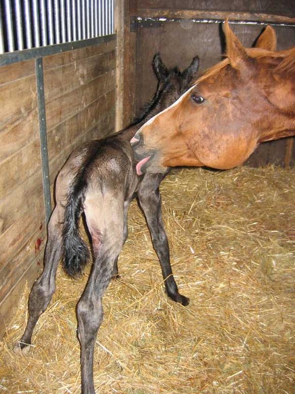 Roxanne foaled last night around 8pm and had a filly. Here are some pics, though I didn't get any real play by play action because one of the other mares was trying to steal the foal at birth and we had to chase her away.